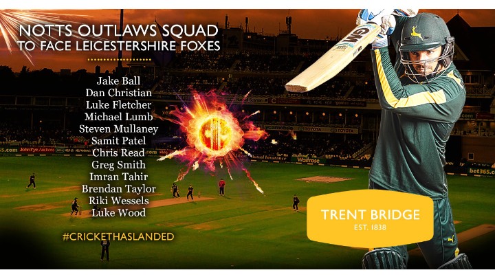 Notts Outlaws squad to face Leicestershire Foxes (from): Jake Ball, Dan Christian, Luke Fletcher, Michael Lumb, Steven Mullaney, Samit Patel, Chris Read, Greg Smith, Imran Tahir, Brendan Taylor, Riki Wessels and Luke Wood.