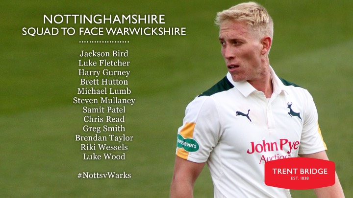 Nottinghamshire squad to face Warwickshire (from): Jackson Bird, Luke Fletcher, Harry Gurney, Brett Hutton, Michael Lumb, Steven Mullaney, Samit Patel, Chris Read, Greg Smith, Brendan Taylor, Riki Wessels and Luke Wood.