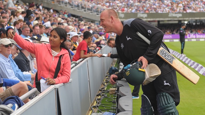 It was great to see home-grown favourite Luke Fletcher, having just returned from a nets session, hold his bat aloft to salute the Outlaws followers - and then high-five young fans as he walked around the edge of the ground.