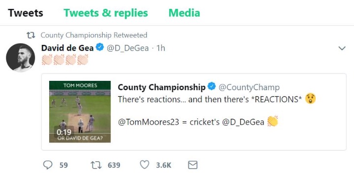 Nottinghamshire wicketkeeper Tom Moores has been singled out for praise on social media by none other than Manchester United goalkeeper David de Gea.
