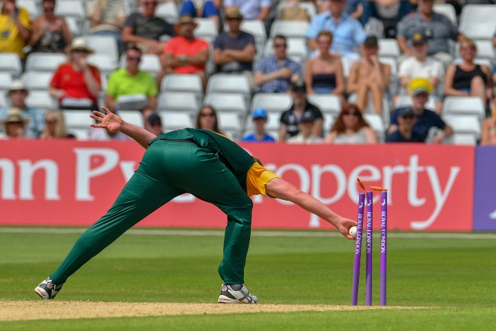 Jake Ball takes a catch on the boundary to dismiss Ed Pollock and hand Matt Carter his maiden List A wicket.