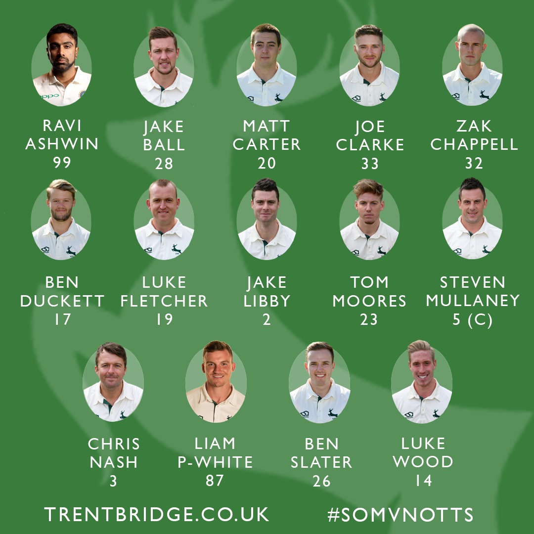 Nottinghamshire squad to face Somerset (from): Ravi Ashwin, Jake Ball, Matthew Carter, Joe Clarke, Zak Chappell, Ben Duckett, Luke Fletcher, Jake Libby, Tom Moores, Steven Mullaney (captain), Chris Nash, Liam Patterson-White, Ben Slater and Luke Wood.