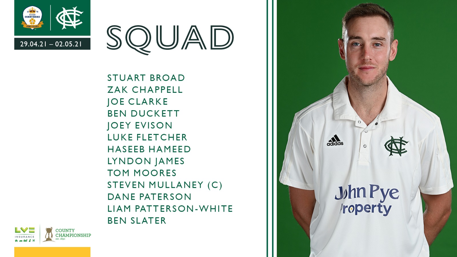 Stuart Broad returns to the 13-man squad for the fixture at the Incora County Ground, while Tom Barber and Matt Carter miss out.