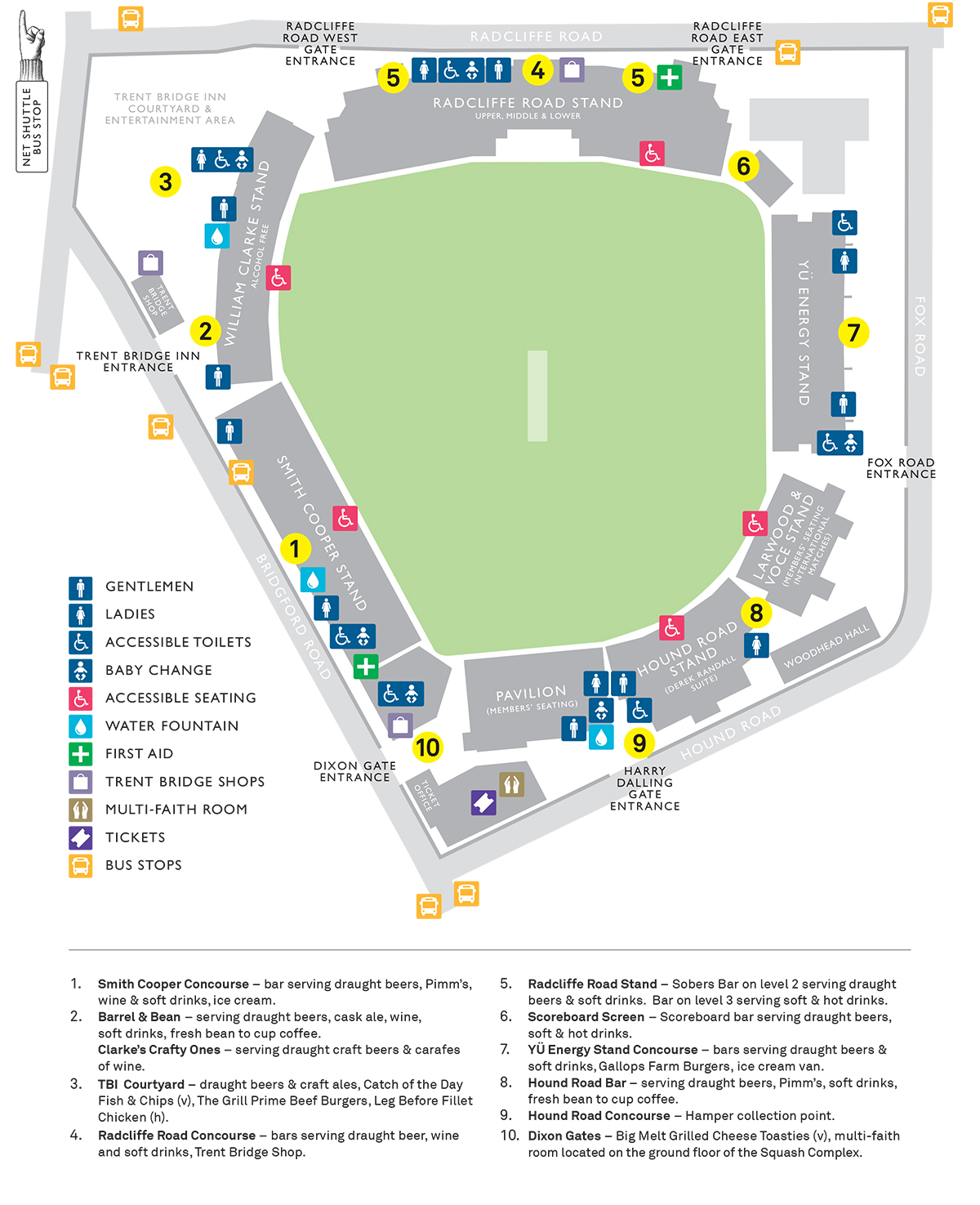 We have gates through which to enter the ground situated on Bridgford Road, Radcliffe Road, Hound Road and Fox Road. Your ticket will indicate which gate you should use.