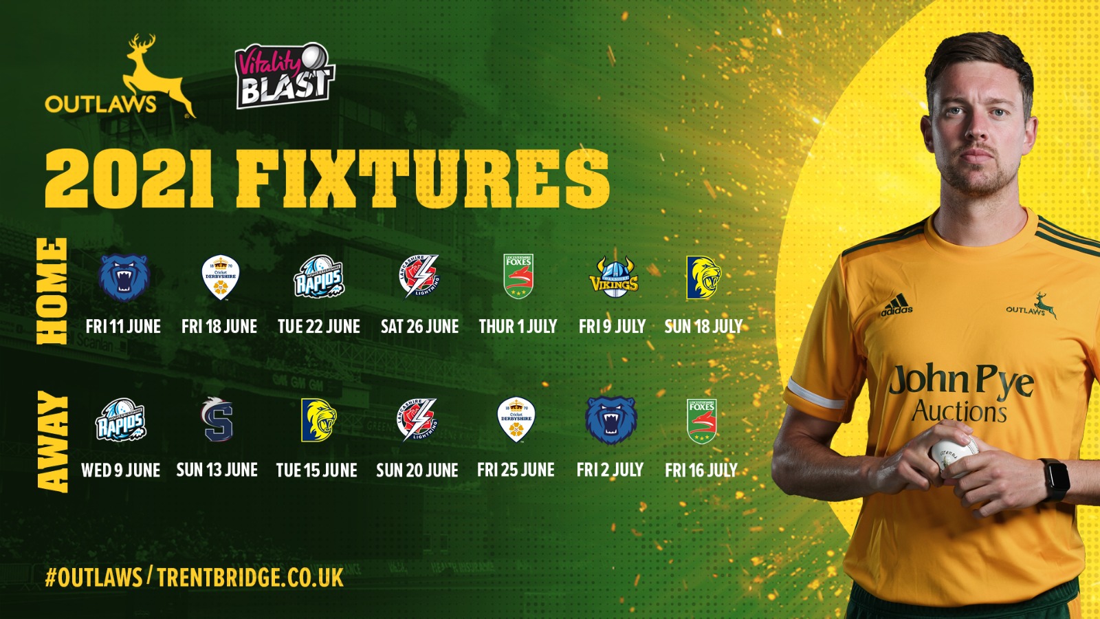 Notts Outlaws’ fixture schedule for 2021 has been announced, featuring three opportunities for supporters to make the Vitality Blast at Trent Bridge a firm fixture for their Friday nights.