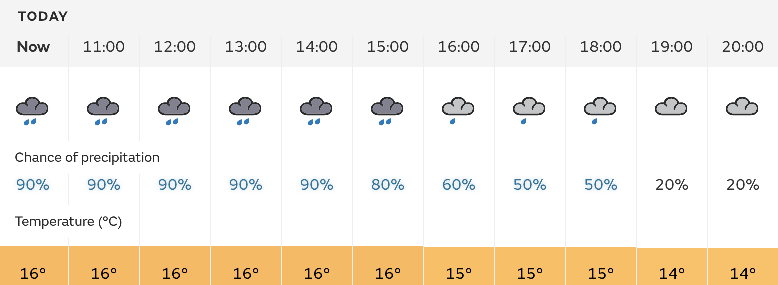10:55 - We will not be starting on time here - the rain continues to lash down. The forecast for the day: