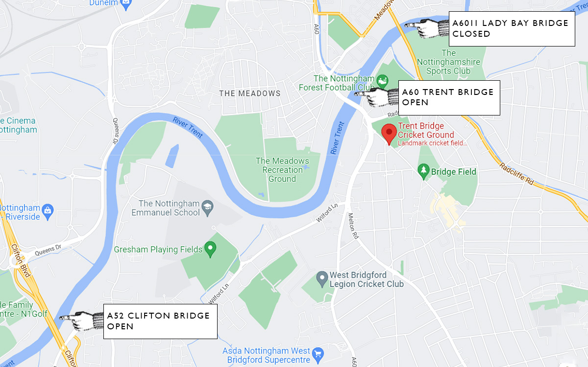 Travellers arriving by car are should note that Lady Bay Bridge over the River Trent (A6011) is currently closed to all traffic following a recent accident. The nearest bridge over the Trent by road is Trent Bridge itself (A60), with an alternative route also possible over Clifton Bridge (Clifton Boulevard/ A52):