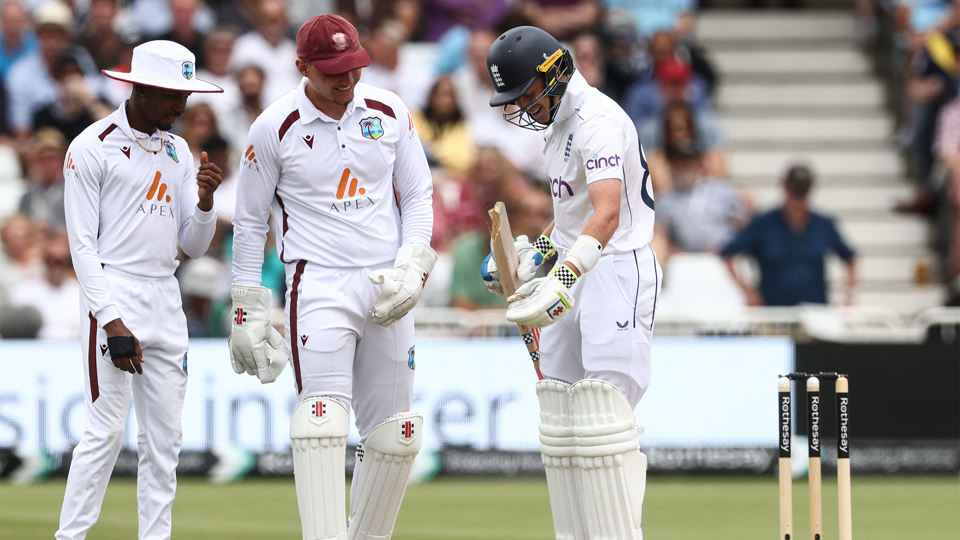 With the very next ball, Ollie Pope experienced an equipment malfunction, a sizeable chunk at the bottom of his bat splintered apart by a full delivery from Alzarri Joseph - the glorious quirks of this game.