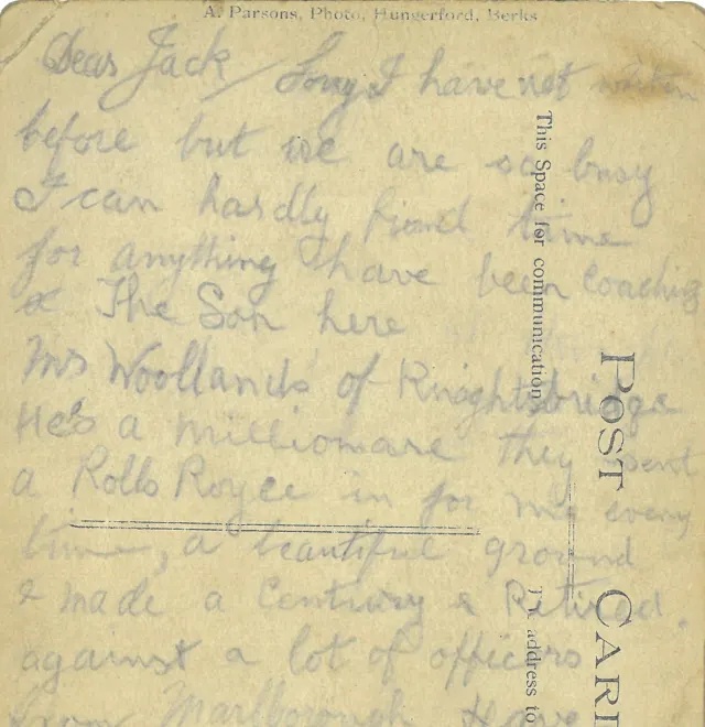 Sorry I have not written before but we are so busy I can hardly find time for anything. Have been coaching the son here. Mr Woollands of Knightsbridge. He’s a millionaire. They send a Rolls-Royce in for me every time, a beautiful ground. I made a century and retired against a lot of officers from Marlborough. Have been into Ramsbury tonight to Wollands. It’s about 6 or 7 miles from here. Hope to see you soon. We are taking our last leave 6 days before we depart for France.