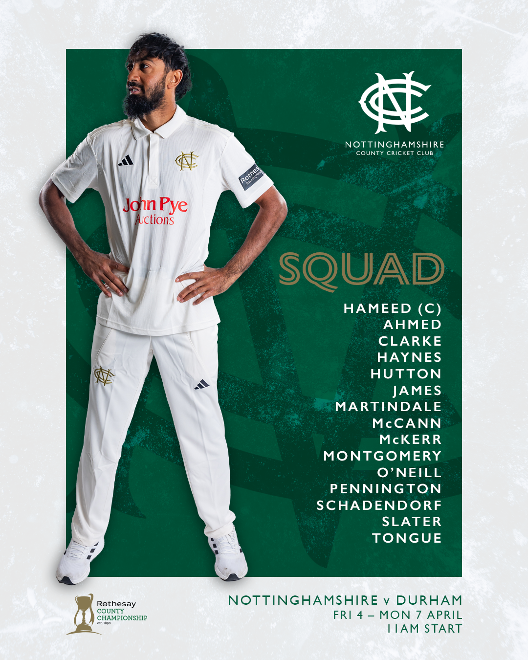 Hameed leads a 15-strong group that has been named by Head Coach Peter Moores to take on the North East outfit at Trent Bridge from tomorrow, Friday 4 April (11am start).