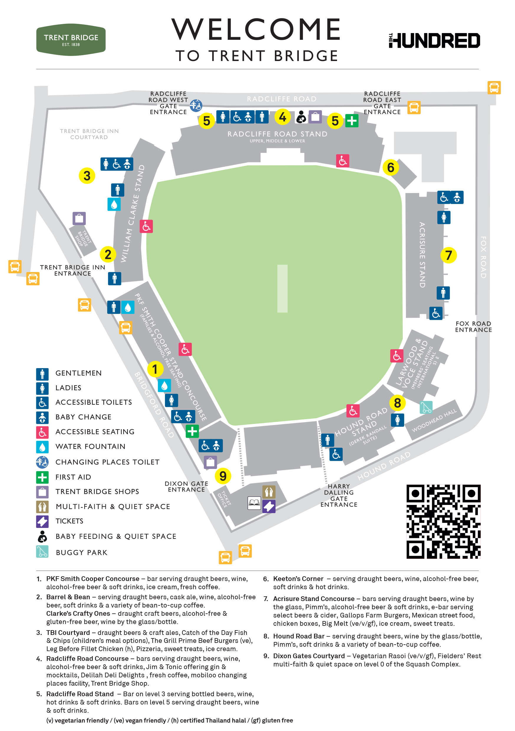 There are a range of food and drink outlets within the ground to suit all tastes, including vegetarian, vegan, gluten-free and halal options. Please note that Trent Bridge is a cashless venue. Food options include: