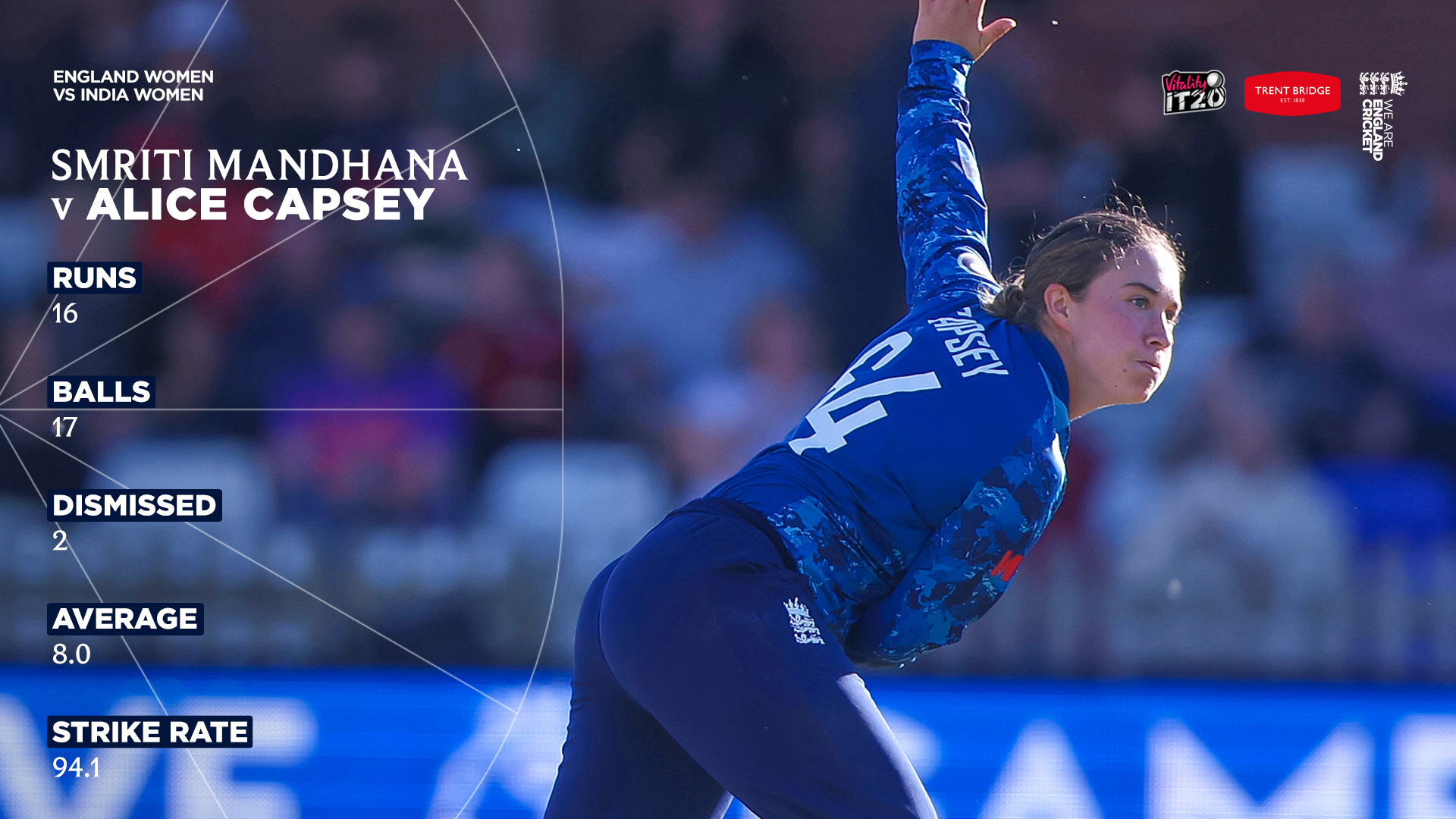 Capsey first came up against Mandhana in T20 cricket in the semi-finals of the Birmingham 2022 Commonwealth Games, and has since shared the field with her on 16 further occasions, including in seven internationals.